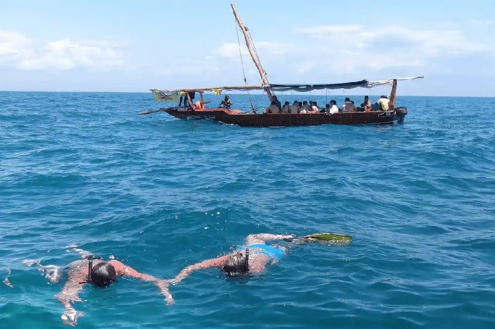 The highlight of the trip is the two pristine sandbanks—soft white stretches of sand rising out of the clear blue Indian Ocean. In the morning, the dhow anchors at one of these sandbanks, allowing guests to relax, swim, or snorkel in the calm shallow waters. With snorkeling equipment and experienced guides, visitors can explore the colorful coral reef teeming with tropical fish. Beginners receive instruction, and fresh coconuts and local snacks are available throughout the day, creating a true tropical island experience.